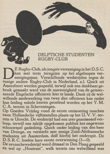 Op initiatief van de Delftse studenten J.L. Schurink en J.F. Ebeling werd op 24 september 1918 de Delftsche Studenten Rugby-Club opgericht. Dat lezen we in de Delftsche studenten-almanak voor het jaar 1919. In jaarlijks uitgegeven almanakken doen de verenigingen die deel uitmaken van het Delftse Studenten Corps verslag van de stand van zaken van hun vereniging. De almanak met het jaartal 1919 geeft de stand van zaken in de laatste maanden van 1918 weer. Als er sprake is van het afgelopen verenigingsjaar is dat dus het jaar 1917-1918. De verslagen in de almanakken en de krantenartikelen uit die tijd vormen samen een redelijk gedetailleerde geschiedschrijving van de Delftsche Studenten Rugby-Club. En ook van de eerste jaren van de Nederlandse Rugby Bond. Waar nodig zal er naar de betreffende almanak verwezen worden. De Delftsche studenten-almanak voor het jaar 1920 wordt dan kortheidshalve aangeduid met Almanak 1920, etcetera.