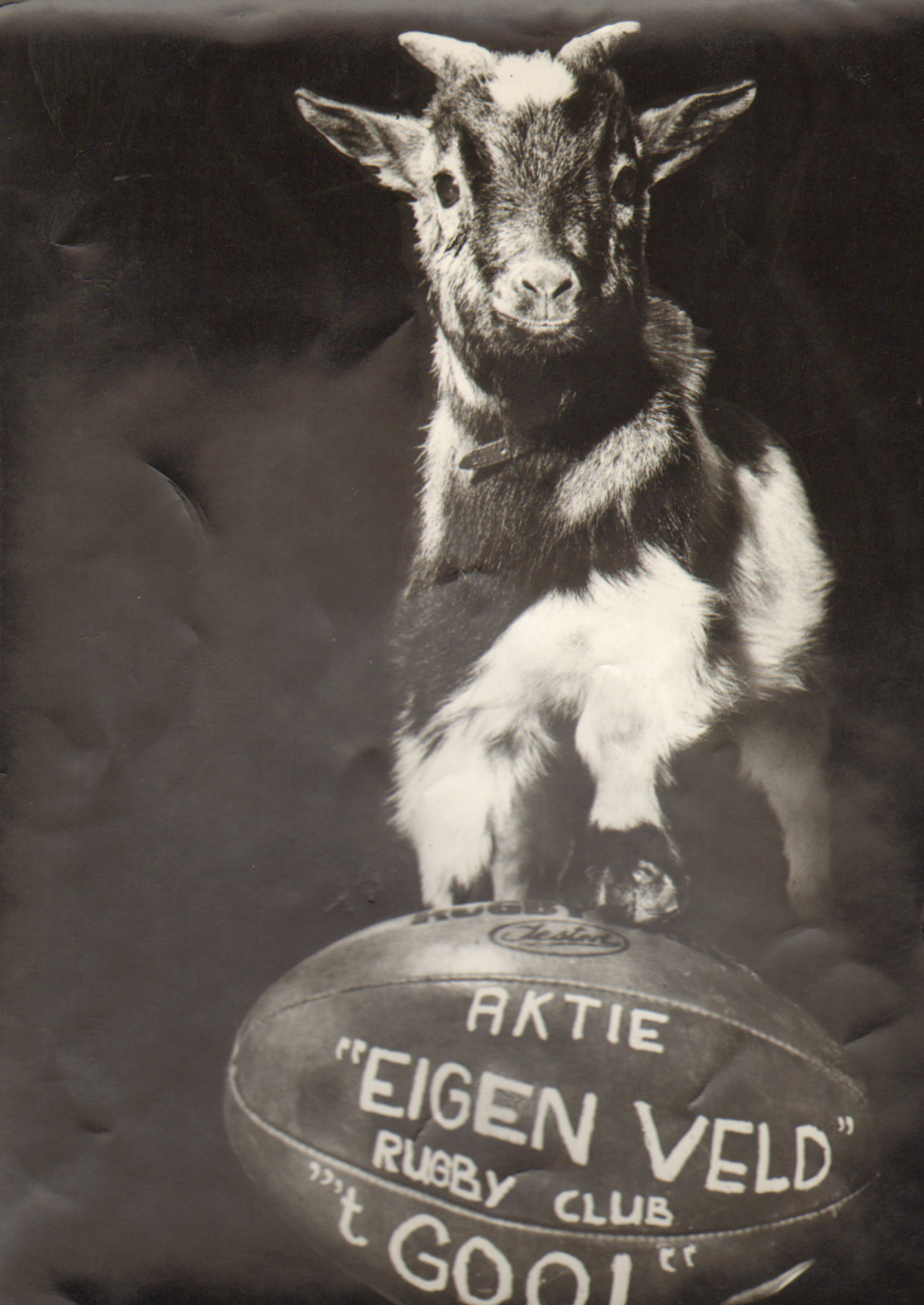 Het bokje “Diederik van Nijveld” was het symbool van de actie “eigen veld”. Pim Westerweel vervoerde het beestje naar de evenementen, waarbij zijn aanwezigheid gewenst was. Pim’s Saab moest elke keer na het vervoer grondig gereinigd worden van Diederiks keutels.