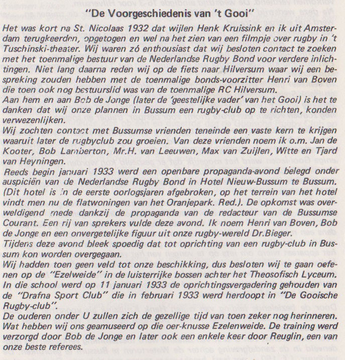 Was het nou in februari 1933, in 1932 of op een ander moment, dat Rugby Club ’t Gooi werd opgericht? Een vraag die bij de club rond elke lustrumviering wel de kop opsteekt. Die onduidelijkheid over de oertijd van de club komt doordat er geen ooggetuigen meer zijn, geheugens rare dingen zijn, het clubarchief weinig aanknopingspunten biedt en er briefpapier is gevonden, waarop als oprichtingsjaar 1932 staat vermeld. In het jubileumboek RC ’t Gooi 1933-1983 wordt het verhaal van André Talboo geciteerd, verteld in de Scrum van september 1946. Samen met Henk Kruissink nam hij het initiatief tot oprichting van de club.