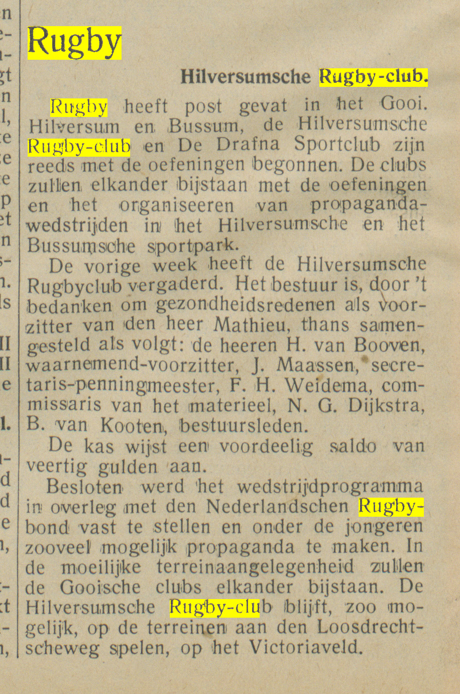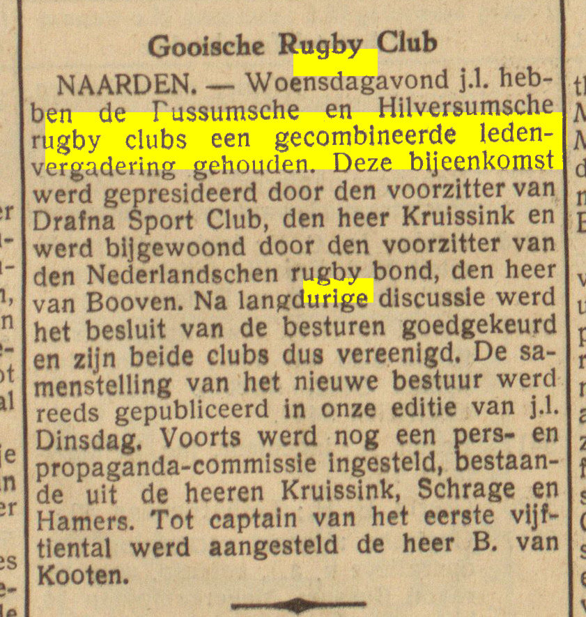 De Gooi- en Eemlander zal er indertijd vast wel over geschreven hebben, dachten we. Googlen op ‘archief Gooi- en Eemlander’ leverde op, dat dit archief was overgedragen aan het Streekarchief Gooi en Vechtstreek. Op hun website het zoekwoord ‘rugby’ ingevoerd en als periode 1932 – 1933. Het resultaat was boven verwachting. Tientallen berichten waarin het woord ‘rugby’ voorkwam! Meest uit De Bussumsche Courant (D.B.C.) en ook enkele uit De Gooische Post (D.G.P.). Bij elkaar bijna een van-dag-tot-dag verslag van de eerste stapjes van de nieuwe rugbyclub, opgeschreven op het moment zelf. Loopt u even mee?