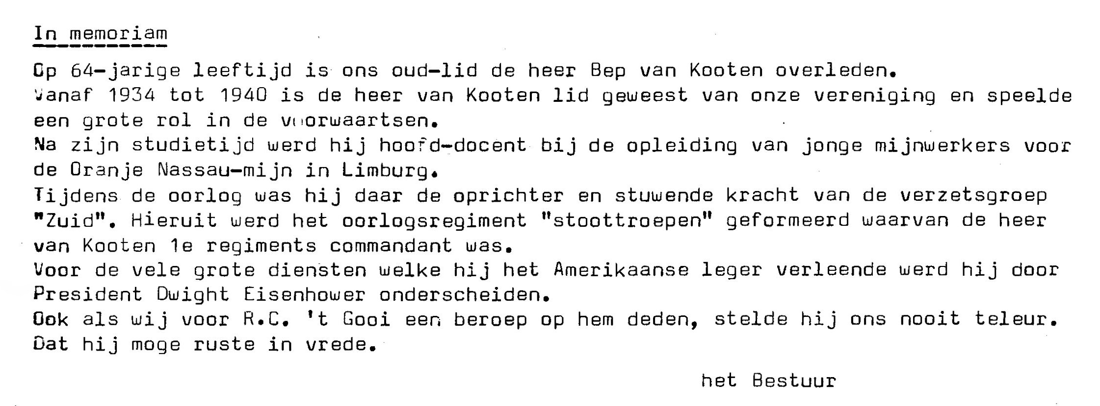Ik werd zelf in m’n diensttijd in 1972 bij de Stoottroepen geplaatst. In 2005 werkte ik mee aan een boek, gebaseerd op het dagboek van een Stoottroeper, over de strijd in Nederlands-Indië in de periode 1945-1948. De naam Bep van Kooten kende ik in dat verband. Maar dat hij net als ik bij RC ’t Gooi rugby had gespeeld maakte het toeval wel heel erg groot! Reden genoeg om eens wat meer aan de weet te komen over deze opmerkelijke Gooier.