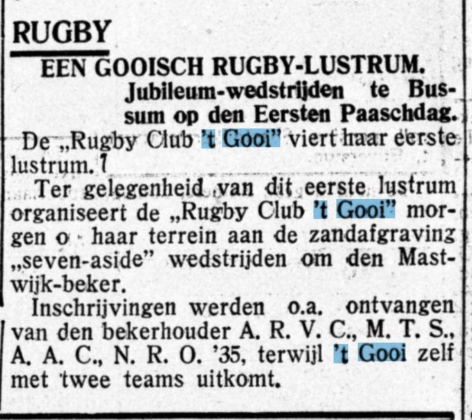 De geslaagde avond begon met een vrijwel volle zaal. Tegen middernacht, toen het feestbal begon, was deze volledig volgelopen. Onder meer RC ’t Gooi-voorzitter H.L. van Zalinge sprak bij het eerste lustrum waarderende woorden voor Jan Hagoort. Aan RC ’t Gooi werd op de feestavond de zilveren Mastwijk-wisselbeker uitgereikt. Die hadden ze kort daarvoor – op eerste Paasdag – gewonnen op hun eigen seven a side rugbytoernooi, op het terrein aan de zandafgraving bij de Bussumse watertoren.