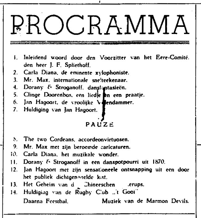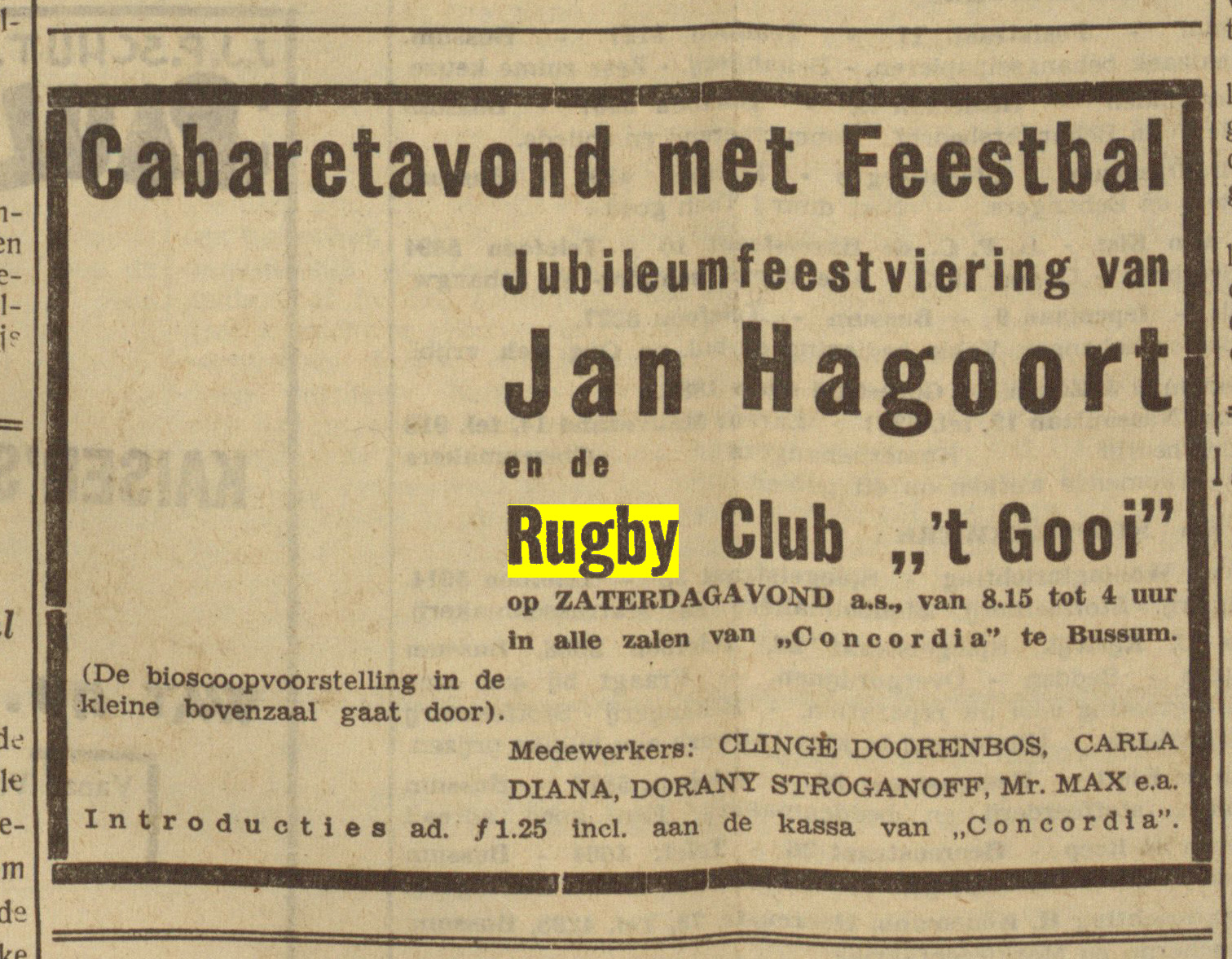 Een slimme formule, om twee feestelijke aanleidingen te combineren. Meer kans op een goedgevulde zaal en dus minder risico en organisatorisch gedoe voor de rugbyclub. Jan Hagoort deed zoiets wel vaker, met een vereniging die iets te vieren had. Hij was ‘wereldberoemd’ in het Gooi en omstreken. Met een aantal andere artiesten stelde hij voor het eerste lustrum een cabaretprogramma samen, met feestbal na. Het programma op die 23ste april was meer dan avondvullend: van 20.15 tot 4.00 uur.