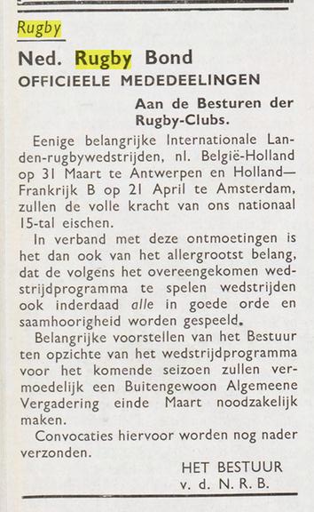 In Sport in Beeld van 12 maart 1935 deelde het bestuur van de Nederlandse Rugby Bond officieel mede, dat er twee belangrijke interlands aan zaten te komen. Krap drie weken later, op 31 maart zou er in Antwerpen tegen België worden gespeeld. En weer drie weken later, op 22 april in Amsterdam tegen niets minder dan Frankrijk. Frankrijk B weliswaar, want anders zou het krachtsverschil wel héél erg groot worden. Maar toch: Frankrijk! Het bondsbestuur deed een beroep op de clubs om alle wedstrijden van het overeengekomen wedstrijdprogramma ”alle in goede orde en saamhorigheid” te spelen. Blijkbaar was dat niet vanzelfsprekend.