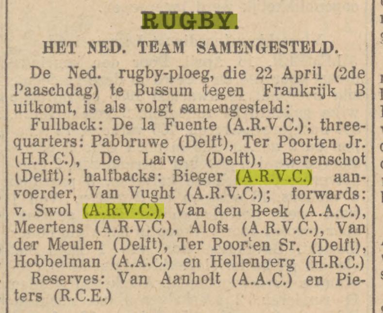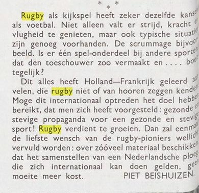 “Men moet den wedstrijd Nederland-Frankrijk B. die Paasch-Maandag een opgewekt en talrijk publiek in het Bussumsche sportpark bracht, niet zoozeer als een belangrijk strijd-evenement beschouwen. Per slot van rekening spelen de Franschen al veel en veel langer rugby… Het is waarachtig al mooi genoeg, dat wij een 15-tal jonge kerels wisten te verzamelen, die zich ijverig en enthousiast weerden. Ze moesten een 66-11 overwinning over de grenzen laten gaan (…). Was het resultaat in cijfers voor Nederland dus verre van gunstig, uit propagandistisch oogpunt was er sprake van een voortreffelijken sportieven middag” vond Sport in Beeld.