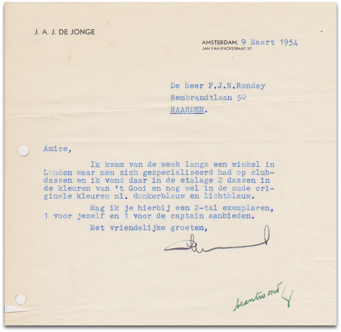 “Stropdassenbriefje” van ons erelid Bob de Jonge uit 1954