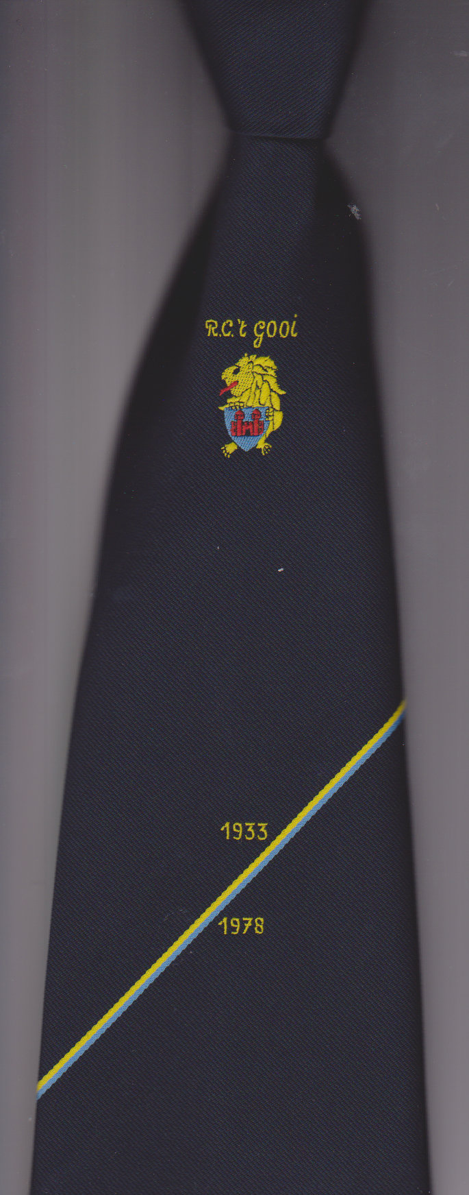 Dat geldt zeker niet voor de RC ’t Gooi lustrum-stropdas uit 1978. Een typisch tijdsbeeld: breed als een schort en met dezelfde leeuw-met-de-dikke-nek, die nog steeds in de Poort naast de open haard aan de muur hangt. Je moet ervan houden, zullen we maar zeggen.